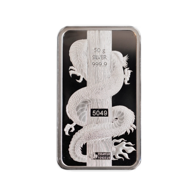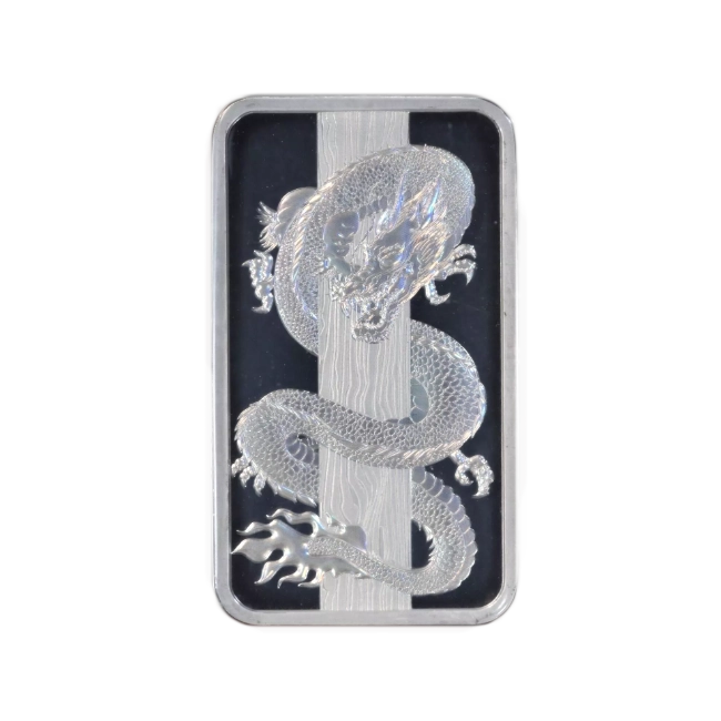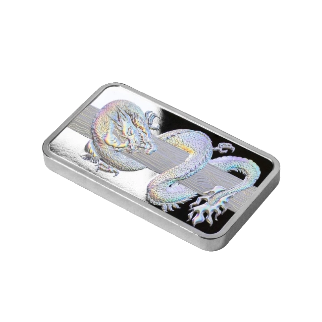 La barra de plata Dragón Holograma de 50 g 2024 de Pamp Suisse, muestra una representación holográfica de un majestuoso Dragón Chino, que simboliza fuerza, poder y prosperidad. Meticulosamente elaborada con plata de primera calidad con un 99,99 % de pureza, esta barra es un testimonio de su exquisito diseño y su impecable artesanía.