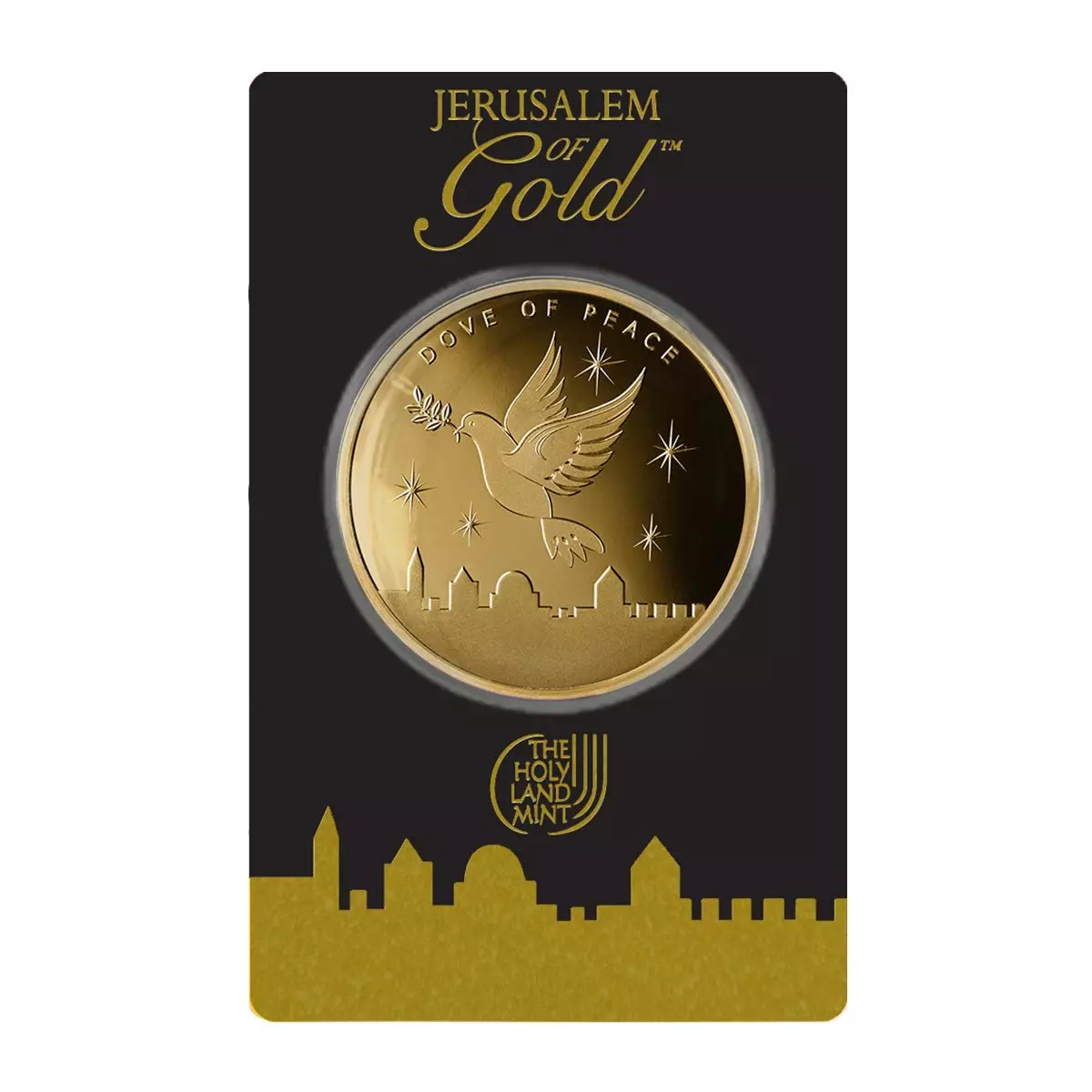 La Moneda de oro israelí "Paloma de la Paz" presenta una paloma con una rama de olivo en el pico, volando sobre las murallas de la Ciudad Vieja de Jerusalén.