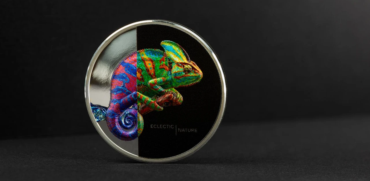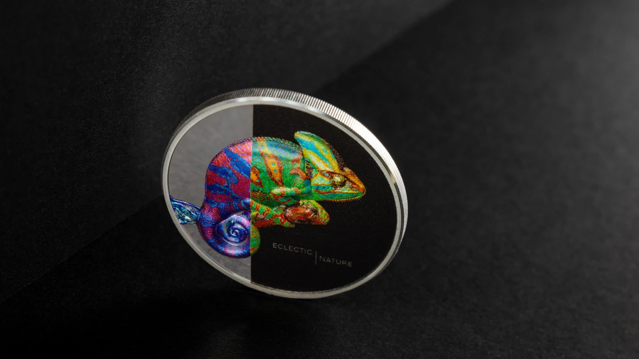La moneda “Chameleon” de la prestigiosa serie Eclectic Nature es una pieza numismática de colección de alta calidad que combina arte, naturaleza y ejecución técnica en un diseño excepcional. Emitida por las Cook Islands en 2023 con un valor nominal de 5 Dólares, esta moneda está acuñada en plata fina 0,9999 y pesa 1 onza troy (31,1 g), con un diámetro de 38,61 mm que la pone en el estándar ideal para coleccionistas de piezas finas. Su acabado Proof y Ultra High Relief, logrado mediante tecnología de acuñación avanzada, realza cada detalle del diseño con relieves pronunciados y contrastes que hacen que las zonas espejadas y los detalles coloridos destaquen de manera impresionante; además, cada unidad viene protegida en su presentación original con cápsula, estuche y certificado de autenticidad. La tirada está limitada a 1 500 ejemplares, lo que asegura exclusividad y atractivo para quienes buscan piezas singulares con potencial de revalorización. El diseño central rinde homenaje al camaleón velado, un reptil fascinante originario de las regiones áridas de Yemen y Arabia Saudita, destacando su característica estructura en la cabeza conocida como casco, la cual le permite captar agua y adaptarse a su entorno seco; esta representación colorida captura la esencia dinámica y cambiante del animal, convirtiendo la moneda no solo en un objeto de valor numismático sino también en una obra de arte inspirada en la biodiversidad. Perfecta para colecciones temáticas de fauna, piezas de inversión en plata o como regalo especial para amantes de la naturaleza, la moneda “Chameleon” combina calidad, belleza y exclusividad en una sola pieza.