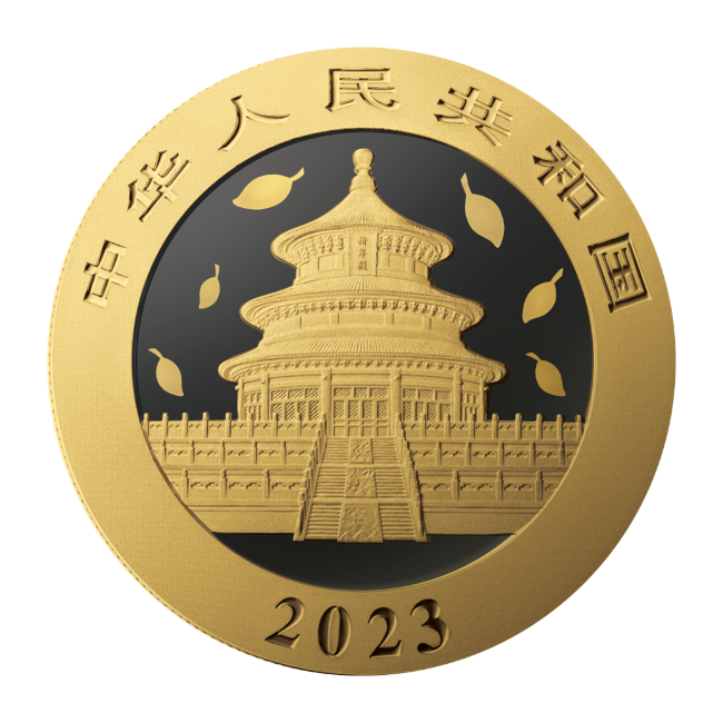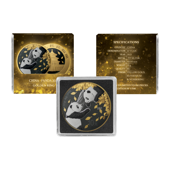 La última edición del 2023 del Panda Chino chapado en oro y rutenio, lo que ha contribuido a resaltar la belleza de las monedas clásicas y a realzar sus detalles. El oro cubre no sólo el anverso y el reverso, sino también el canto y el borde, de ahí el nombre de la serie “Anillo de Oro”.