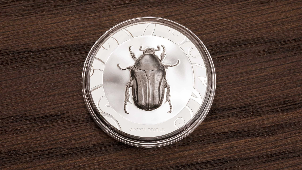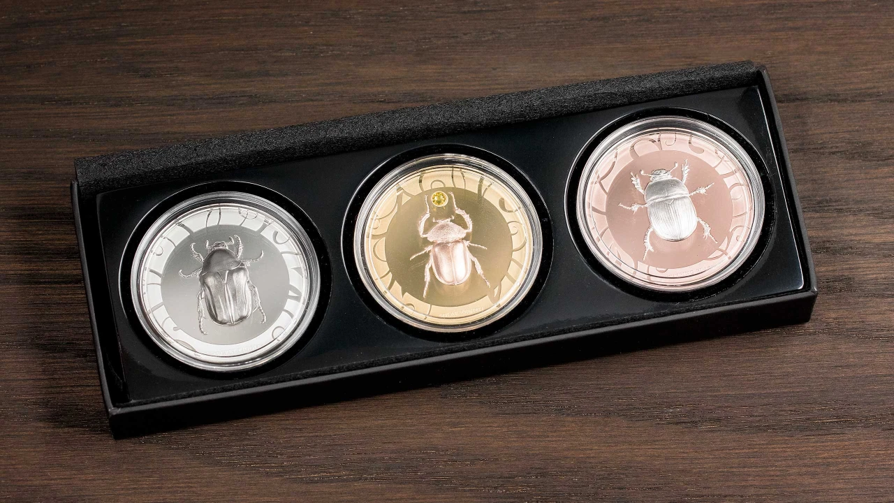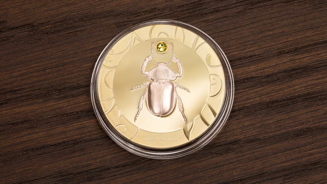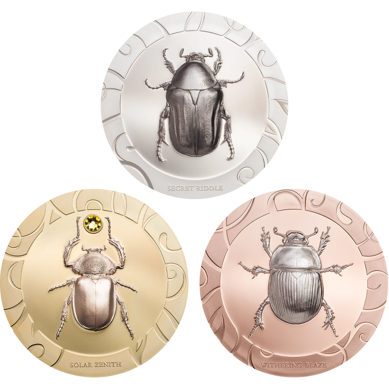 la primera moneda, denominada Secret Riddle, exhibe un escarabajo con tratamiento de rodio negro sobre superficie espejada que resalta el contraste y profundidad del motivo; la segunda, Solar Zenith, es especialmente singular y valiosa desde el punto de vista estético por incluir un cristal Swarovski incrustado que simboliza el sol dorado y aporta un punto focal tridimensional que intensifica la expresividad del diseño; y la tercera, Withering Blaze, presenta un escarabajo de plata brillante sobre acabado de oro rosa, aportando equilibrio cromático al conjunto.