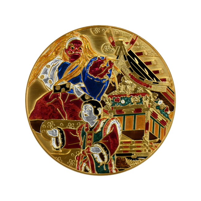 Esta moneda de plata cloisonné ha sido diseñado y fabricado con motivos del Festival de Takayama.