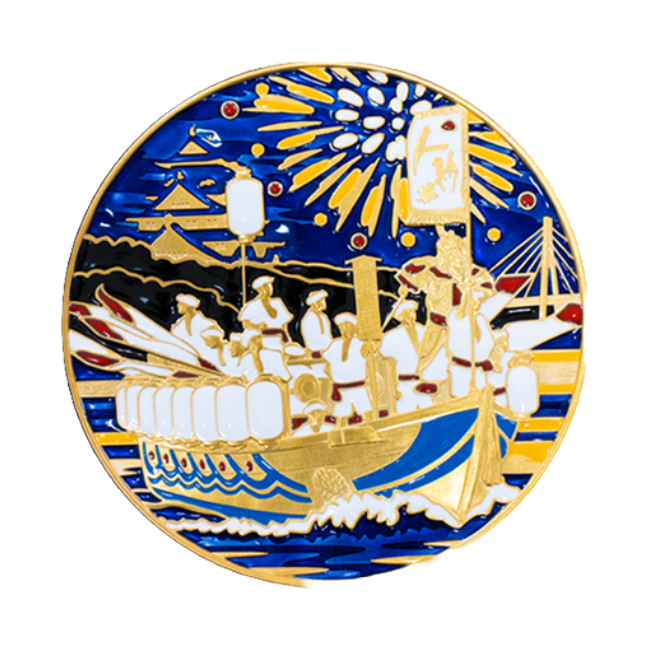 Anverso: “Ningyo-bune” (barco que transporta muñecas tradicionales), “fuegos artificiales”, “Castillo de Osaka” y “Puente Kawasaki” de Funatogyo. Estos están pintados de forma rica y sutil con esmaltes cloisonné en seis colores: amarillo, turquesa, negro, azul de Prusia, transparente, rojo y blanco.