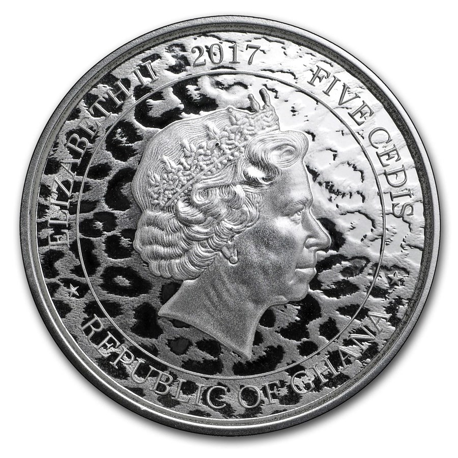 En el anverso, la moneda presenta el retrato en perfil de Elizabeth II, con un fondo texturizado que rememora el patrón del pelaje del leopardo, junto a las inscripciones “ELIZABETH II”, el año 2017, “FIVE CEDIS” y “REPUBLIC OF GHANA”, lo que destaca su carácter de moneda legal respaldada por el país emisor.