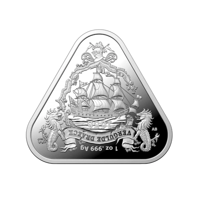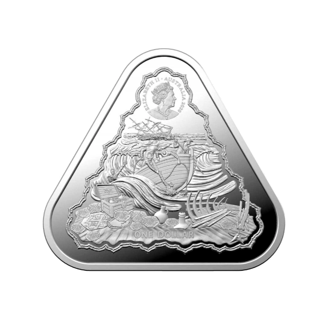 La serie Shipwreck de la Real Casa de la Moneda Australiana continuó en 2020 con un nuevo diseño. Al igual que el primer lanzamiento en 2019, esta moneda triangular de lingotes de plata representa un buque de la Compañía Holandesa de las Indias Orientales que encontró su destino en alta mar después de golpear un arrecife frente a la costa de Australia.