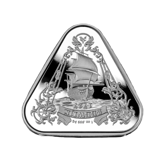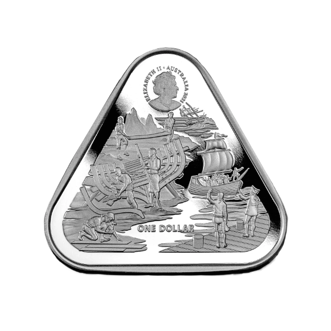 Anverso: Sexto retrato de Su Majestad la Reina Isabel II mirando hacia la derecha llevando la Diadema de Estado del Rey Jorge IV y el Collar de la Coronación Victoriana dentro de un pequeño círculo en la parte superior del triángulo. Debajo se representa el naufragio, la construcción de otro barco y la despedida de los Países Bajos.