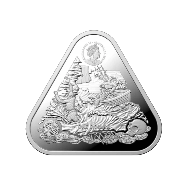 Anverso: Presenta el sexto retrato de la Reina Isabel II, diseñado por Jody Clark. En la parte inferior, se muestra una imagen del naufragio con marineros intentando escapar en un bote salvavidas y un esqueleto con algunas monedas en el fondo del océano1.