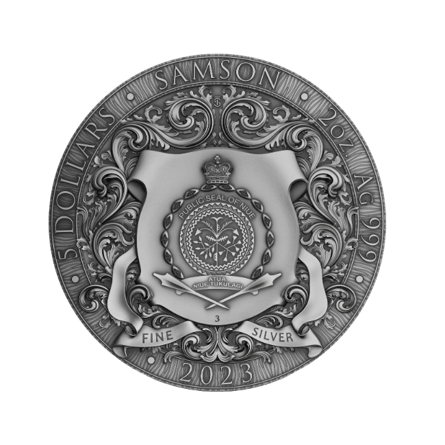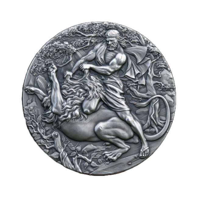 Elaborada con maestría, la moneda de plata de Sansón presenta intrincados detalles que capturan la energía y el dinamismo de la escena. La imagen en relieve de Sansón, concentrado y poderoso, representa la cima de su fuerza inigualable, mientras que las fauces del león expresan asombro y desafío.
